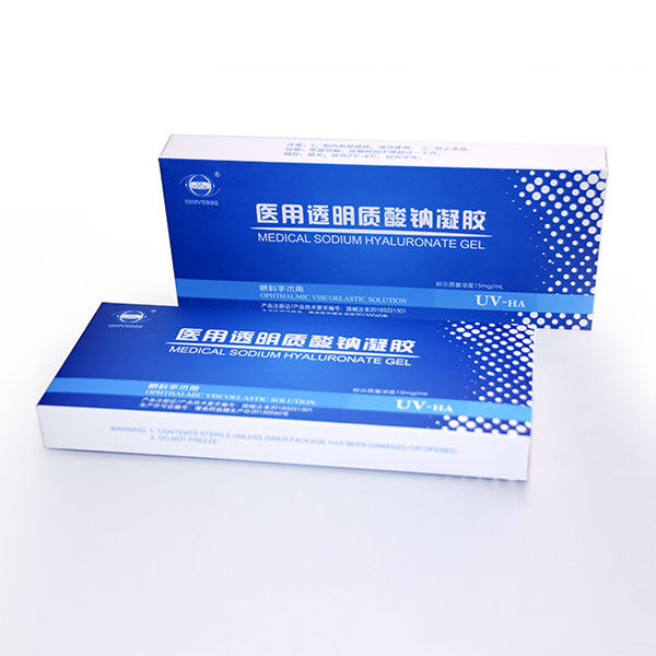 1.5% het ooggel 1.0ml wordt van Natriumhyaluronate vooraf gevuld met een fysiologisch evenwichtige waterige oplossing van natrium hyaluronate in een spuit. De spuitkegel is behandeld met een beschermend GLB en het pakket is uitgerust met een spoelende naald in de zak. Het product is steriel door filtratie het steriliseren en aseptische procesbeheersing, en kan eens worden gebruikt.